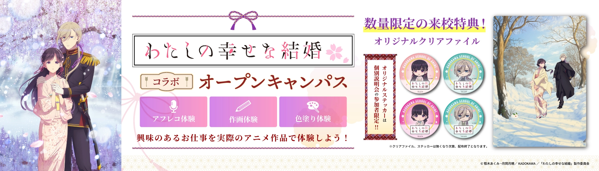 角川KADOKAWA声優専門学校とアニメ「わたしの幸せな結婚」がコラボしたオープンキャンパス実施中!夢のアフレコ体験ができます。声優になりたい中学生・高校生のみなさん、お気軽に参加してくださいね。無料です。